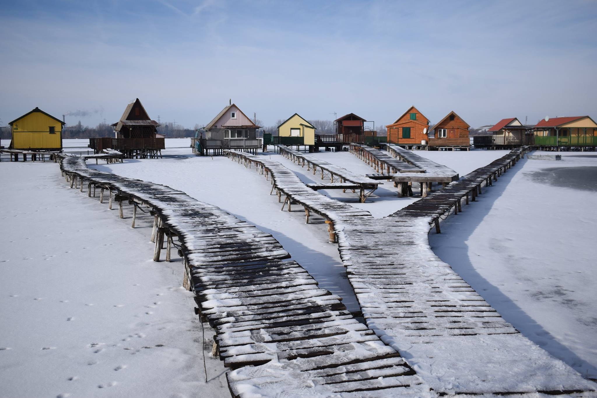 Színek: Egy piros kabát, egy sárga villamos vagy egy barna faház drámai kontrasztot alkot a fehér hóval.
