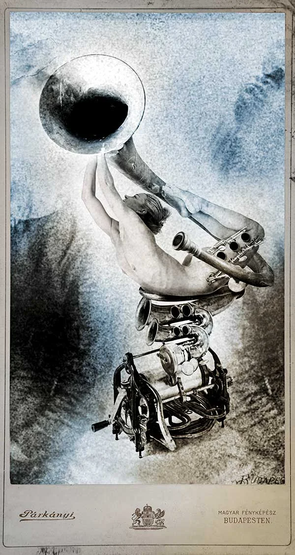 P: Ahogy készítem a szobraimat mindig vannak olyan történetek, olyan állomások, tárgyak, amikből soha nem lesz műalkotás, illetve eddig nem volt. Lehet, hogy ezt nem is én vettem észre először, hanem a környezetem. Festő barátaim mondták, hogy itt olyan „világ” van, amit fotózni kellene. Ekkor kezdtem el, – ráadásul egy fotósorozatként – ezeket a zeneszobrokat. Nagyon hosszú felkészülési időszak volt. Modelleket, élő embereket installáltam össze ún. mozgó szobrokká különböző hangszerekkel, zenelejátszókkal.